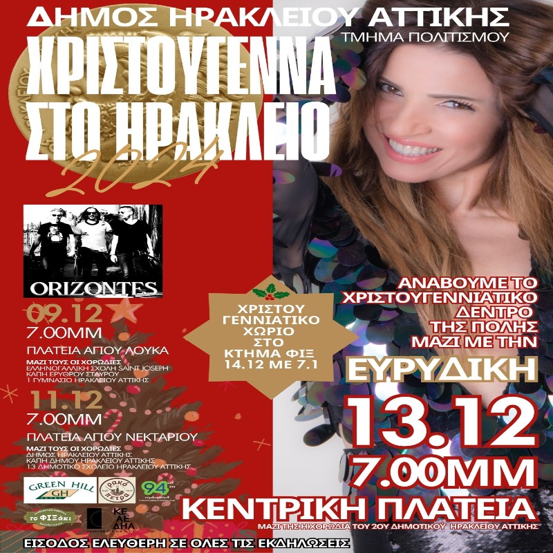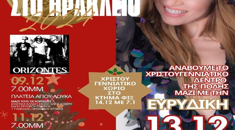 Οι χριστουγεννιάτικοι ρυθμοί ξεκινούν στον Δήμο Ηρακλείου Αττικής την Δευτέρα 9 και την Τετάρτη 11 Δεκεμβρίου στις 19.00 με δύο, διαδοχικές μουσικές εκδηλώσεις, που έχει ετοιμάσει το Τμήμα Πολιτισμού, παρέα με το συγκρότημα Ορίζοντες σε πλατεία Αγίου Λουκά και πλατεία Αγίου Νεκταρίου αντίστοιχα. Την Δευτέρα μαζί τους θα τραγουδήσουν οι χορωδίες της Ελληνογαλλικής Σχολής του Saint Joseph, των ΚΑΠΗ του Ερυθρού Σταυρού και του 1ου Γυμνασίου Ηρακλείου. Παρομοίως την Τετάρτη η χορωδία του Δήμου, η χορωδία των δημοτικών ΚΑΠΗ και τα παιδιά του 13ου Δημοτικού Σχολείου Ηρακλείου.