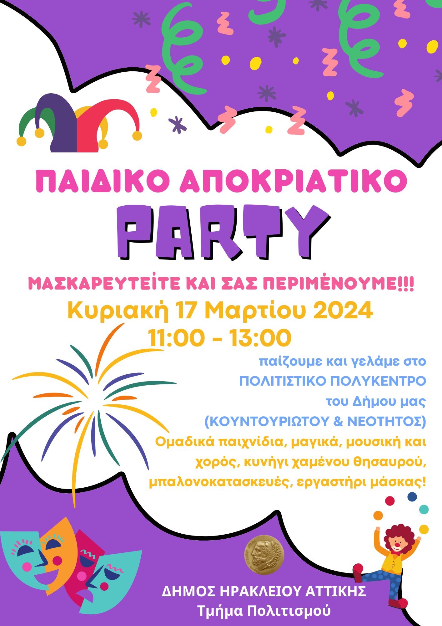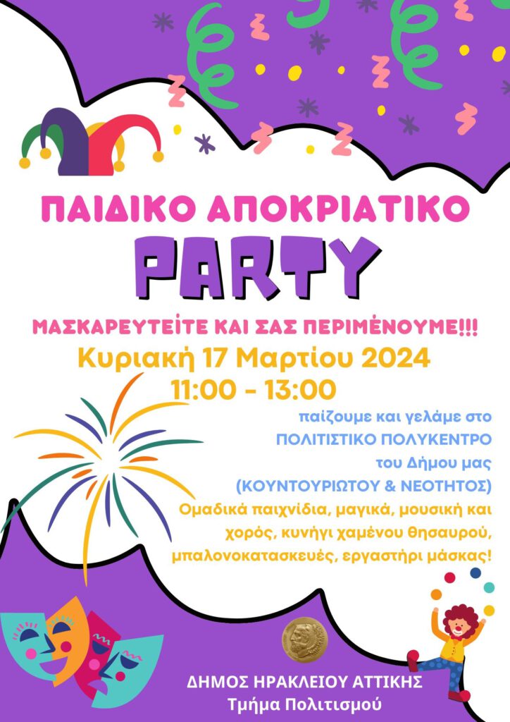 Ένα αποκριάτικο πάρτι για τα παιδιά της πόλης ετοίμασε ο Δήμος Ηρακλείου Αττικής την Κυριακή 17 Μαρτίου από τις 11.00 το πρωί στο Πολιτιστικό Πολύκεντρο «Ηλέκτρα Αποστόλου» (Κουντουριώτου και Νεότητος). Ομαδικά παιχνίδια, μαγικά κόλπα, κυνήγι του χαμένου θησαυρού, μπαλονοκατασκευές, εργαστήρι μάσκας και, φυσικά, πολύ μουσική και χορός είναι μερικά από όσα έχει προγραμματίσει το Τμήμα Πολιτισμού του Δήμου για να γιορτάζουν οι μικροί δημότες τις Αποκριές. Η είσοδος είναι ελεύθερη για όλους.