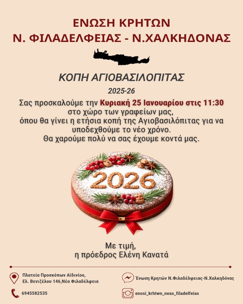 Η Ένωση Κρητών Νέας Φιλαδέλφειας – Νέας Χαλκηδόνας απευθύνει ανοιχτή πρόσκληση στα μέλη και τους φίλους της για την καθιερωμένη κοπή της Αγιοβασιλόπιτάς της, που θα πραγματοποιηθεί την Κυριακή 25 Ιανουαρίου 2026 στα γραφεία του συλλόγου.
