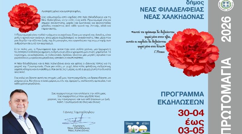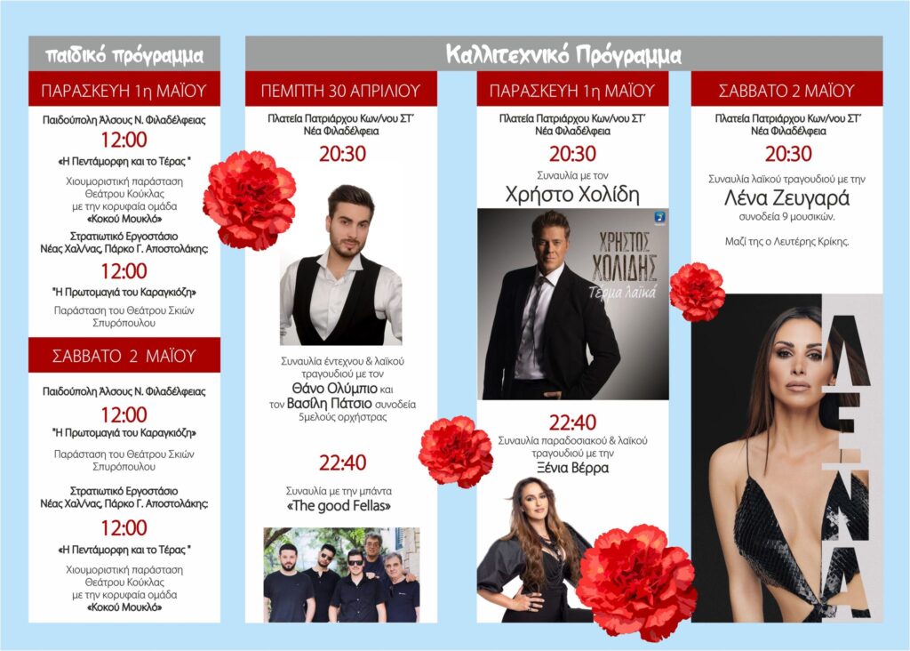 Και φέτος, η πρόσκληση είναι ανοιχτή προς όλους. Ελάτε στη Νέα Φιλαδέλφεια και τη Νέα Χαλκηδόνα για να ζήσετε μια αυθεντική Πρωτομαγιά, γεμάτη φως, μουσική, παράδοση και συναίσθημα. Ελάτε να περπατήσετε στην πόλη, να απολαύσετε τις εκδηλώσεις, να μοιραστείτε όμορφες στιγμές με τους ανθρώπους σας και να νιώσετε τη ζωντάνια μιας περιοχής που ξέρει να γιορτάζει με ψυχή.