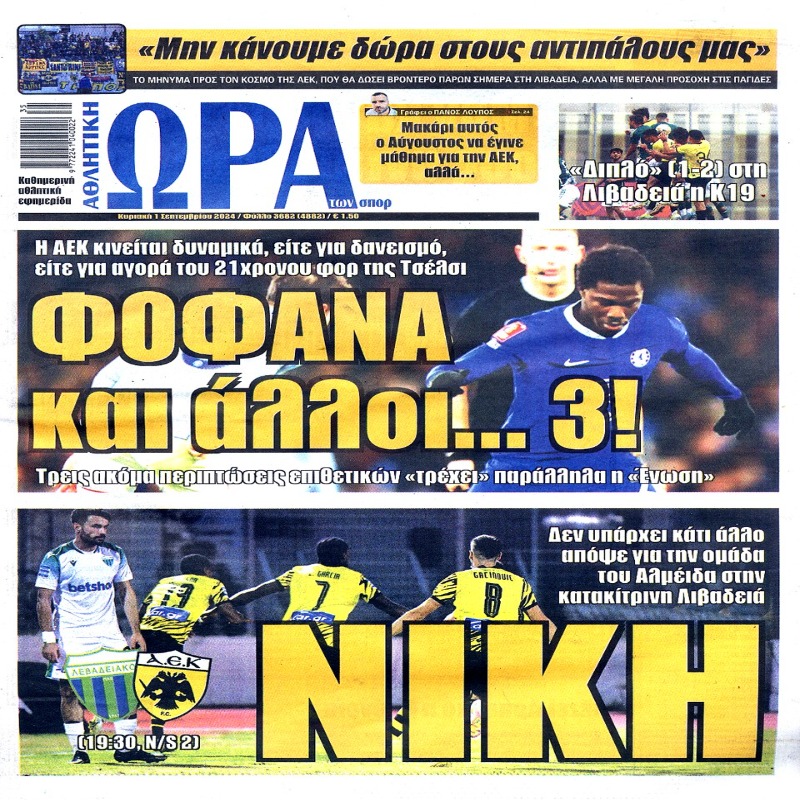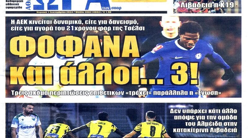 Πρωτοσέλιδα εφημερίδων 1/9/2024. Διαβάστε το Σημερινό Πρωτοσέλιδο της Αθλητικής ΩΡΑΣ των σπορ, οπαδικής εφημερίδας της ΑΕΚ και όλα τα Πρωτοσέλιδα εφημερίδων