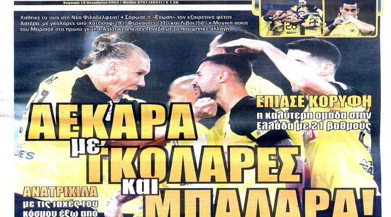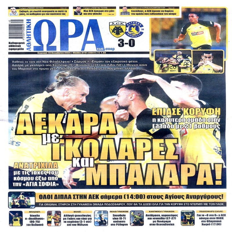 Πρωτοσέλιδα εφημερίδων 10/11/2024. Διαβάστε το Σημερινό Πρωτοσέλιδο της Αθλητικής ΩΡΑΣ των σπορ, οπαδικής εφημερίδας της ΑΕΚ και όλα τα Πρωτοσέλιδα εφημερίδων