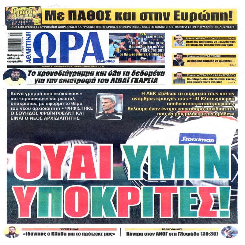 Διαβάστε το Σημερινό Πρωτοσέλιδο της Αθλητικής ΩΡΑΣ των σπορ, οπαδικής εφημερίδας της ΑΕΚ και όλα τα Πρωτοσέλιδα των εφημερίδων 11/10/2023