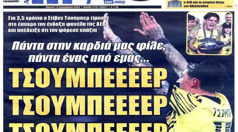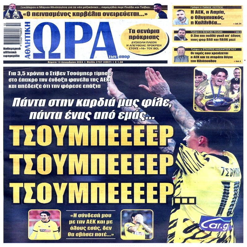 Πρωτοσέλιδα εφημερίδων 12/12/2024 Διαβάστε το Σημερινό Πρωτοσέλιδο της Αθλητικής ΩΡΑΣ των σπορ, οπαδικής εφημερίδας της ΑΕΚ και όλα τα Πρωτοσέλιδα των εφημερίδων