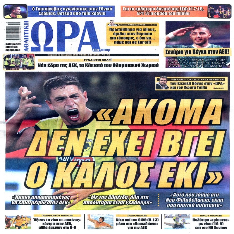 Διαβάστε το Σημερινό Πρωτοσέλιδο της Αθλητικής ΩΡΑΣ των σπορ, οπαδικής εφημερίδας της ΑΕΚ και όλα τα Πρωτοσέλιδα εφημερίδων 15/10/2023