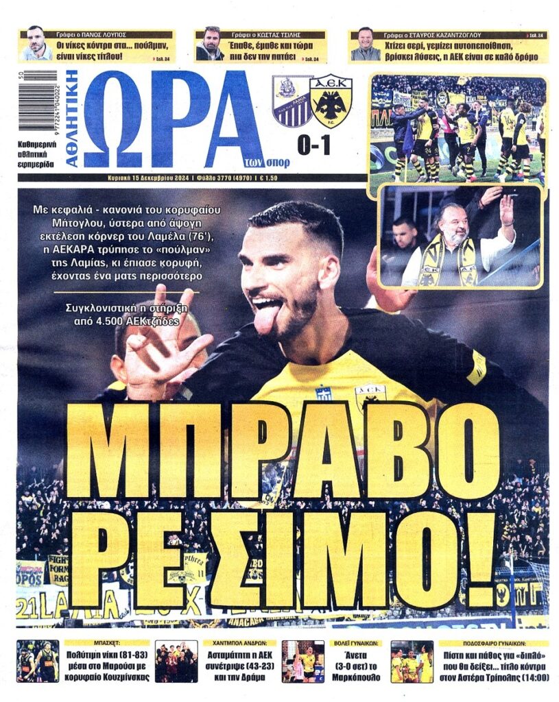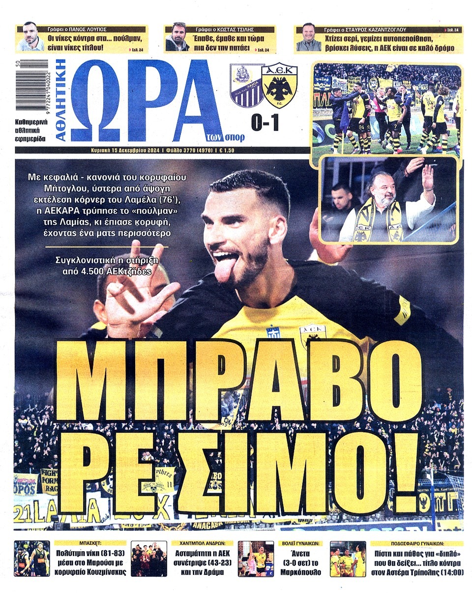 Πρωτοσέλιδα εφημερίδων 15/12/2024. Διαβάστε το Σημερινό Πρωτοσέλιδο της Αθλητικής ΩΡΑΣ των σπορ, οπαδικής εφημερίδας της ΑΕΚ και όλα τα Πρωτοσέλιδα των εφημερίδων