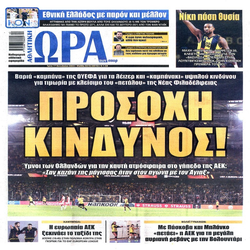 Διαβάστε το Σημερινό Πρωτοσέλιδο της Αθλητικής ΩΡΑΣ των σπορ, οπαδικής εφημερίδας της ΑΕΚ και όλα τα Πρωτοσέλιδα των εφημερίδων 17/10/2023
