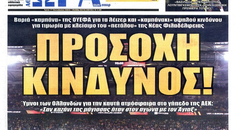 Διαβάστε το Σημερινό Πρωτοσέλιδο της Αθλητικής ΩΡΑΣ των σπορ, οπαδικής εφημερίδας της ΑΕΚ και όλα τα Πρωτοσέλιδα των εφημερίδων 17/10/2023