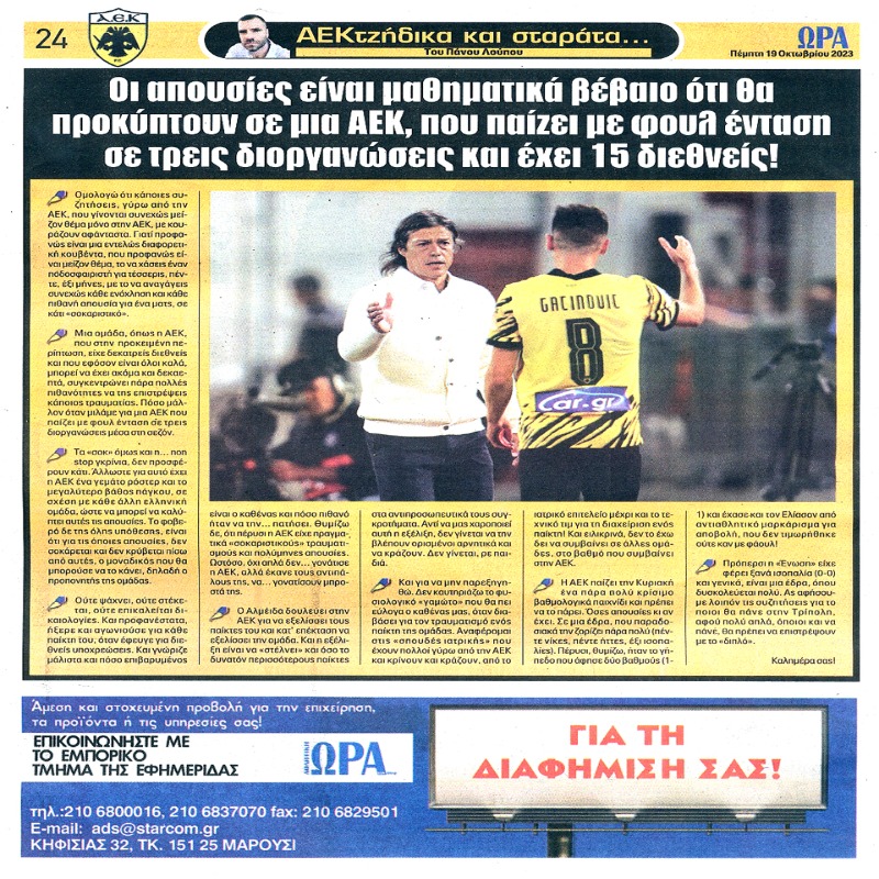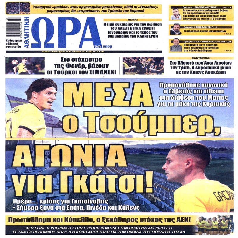 Διαβάστε το Σημερινό Πρωτοσέλιδο της Αθλητικής ΩΡΑΣ των σπορ, οπαδικής εφημερίδας της ΑΕΚ και όλα τα Πρωτοσέλιδα εφημερίδων 19/10/2023