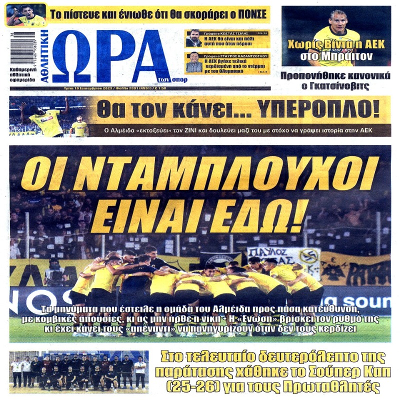Διαβάστε το Σημερινό Πρωτοσέλιδο της Αθλητικής ΩΡΑΣ των σπορ, οπαδικής εφημερίδας της ΑΕΚ και όλα τα Πρωτοσέλιδα εφημερίδων 19/9/2023