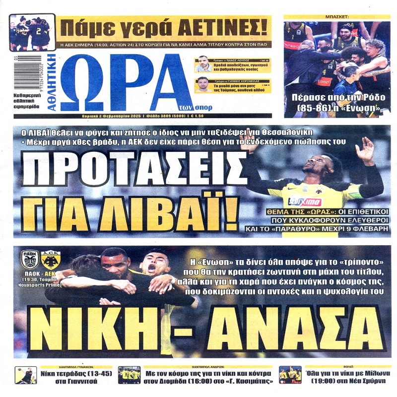 Πρωτοσέλιδα εφημερίδων 2/2/2025. Διαβάστε το Σημερινό Πρωτοσέλιδο της Αθλητικής ΩΡΑΣ των σπορ, οπαδικής εφημερίδας της ΑΕΚ και όλα τα Πρωτοσέλιδα των εφημερίδων