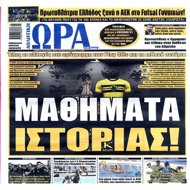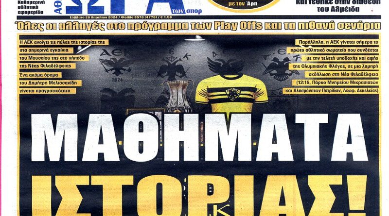 Πρωτοσέλιδα εφημερίδων 20/4/2024. Διαβάστε το Σημερινό Πρωτοσέλιδο της Αθλητικής ΩΡΑΣ των σπορ, οπαδικής εφημερίδας της ΑΕΚ και όλα τα Πρωτοσέλιδα εφημερίδων