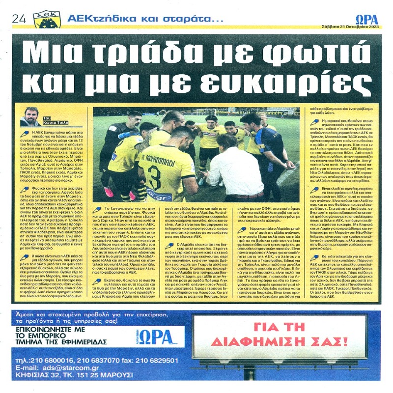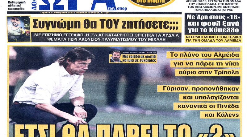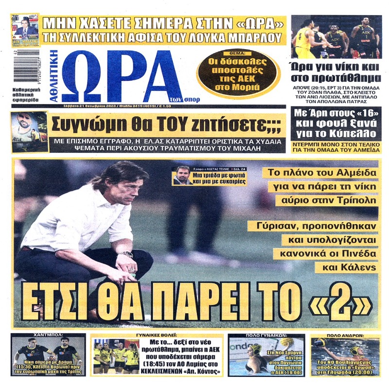Διαβάστε το Σημερινό Πρωτοσέλιδο της Αθλητικής ΩΡΑΣ των σπορ, οπαδικής εφημερίδας της ΑΕΚ και όλα τα Πρωτοσέλιδα των εφημερίδων 21/10/2023