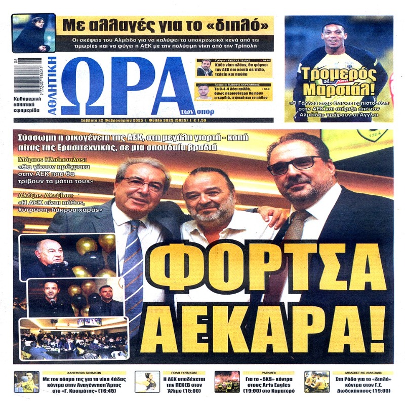 Πρωτοσέλιδα εφημερίδων 22/2/2025. Διαβάστε το Σημερινό Πρωτοσέλιδο της Αθλητικής ΩΡΑΣ των σπορ, οπαδικής εφημερίδας της ΑΕΚ και όλα τα Πρωτοσέλιδα των εφημερίδων