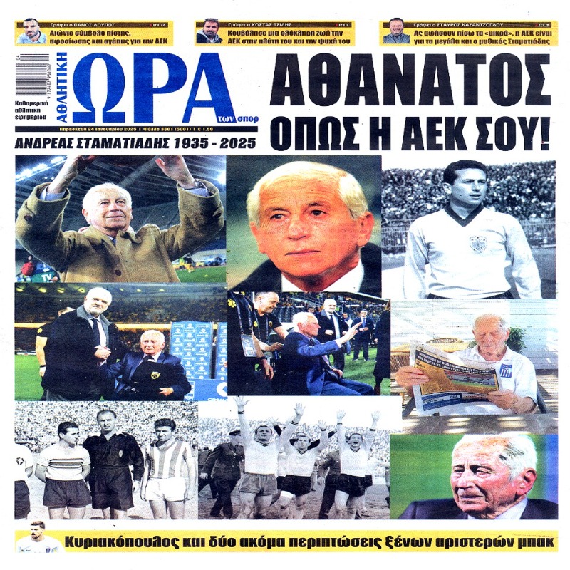 Πρωτοσέλιδα εφημερίδων 24/1/2025. Διαβάστε το Σημερινό Πρωτοσέλιδο της Αθλητικής ΩΡΑΣ των σπορ, οπαδικής εφημερίδας της ΑΕΚ και όλα τα Πρωτοσέλιδα των εφημερίδων