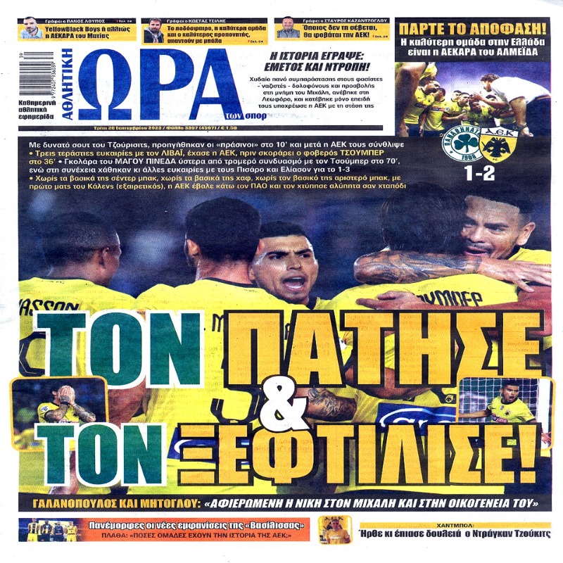 Διαβάστε το Σημερινό Πρωτοσέλιδο της Αθλητικής ΩΡΑΣ των σπορ, οπαδικής εφημερίδας της ΑΕΚ και όλα τα Πρωτοσέλιδα εφημερίδων 26/9/2023