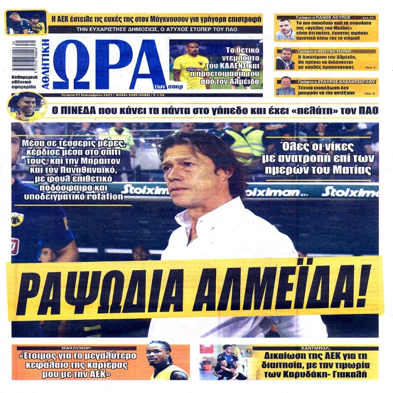 Διαβάστε το Σημερινό Πρωτοσέλιδο της Αθλητικής ΩΡΑΣ των σπορ, οπαδικής εφημερίδας της ΑΕΚ και όλα τα Πρωτοσέλιδα εφημερίδων 27/9/2023