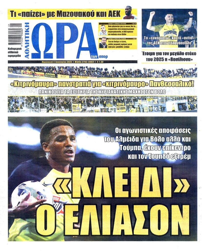 Πρωτοσέλιδα εφημερίδων 3/1/2025. Διαβάστε το Σημερινό Πρωτοσέλιδο της Αθλητικής ΩΡΑΣ των σπορ, οπαδικής εφημερίδας της ΑΕΚ και όλα τα Πρωτοσέλιδα των εφημερίδων