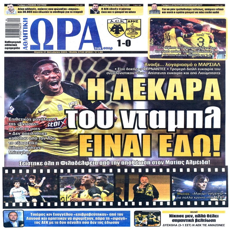 Πρωτοσέλιδα εφημερίδων 31/10/2024. Διαβάστε το Σημερινό Πρωτοσέλιδο της Αθλητικής ΩΡΑΣ των σπορ, οπαδικής εφημερίδας της ΑΕΚ και όλα τα Πρωτοσέλιδα εφημερίδων
