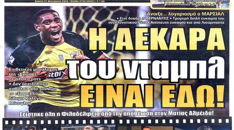 Πρωτοσέλιδα εφημερίδων 31/10/2024. Διαβάστε το Σημερινό Πρωτοσέλιδο της Αθλητικής ΩΡΑΣ των σπορ, οπαδικής εφημερίδας της ΑΕΚ και όλα τα Πρωτοσέλιδα εφημερίδων