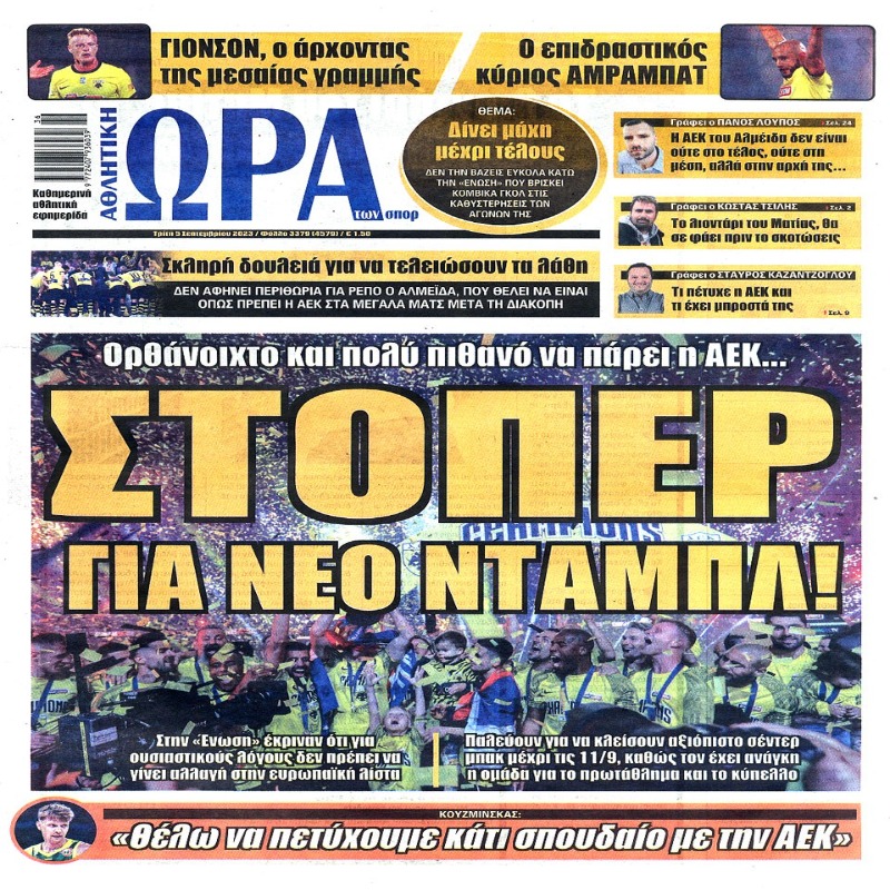 Διαβάστε το Σημερινό Πρωτοσέλιδο της Αθλητικής ΩΡΑΣ των σπορ, οπαδικής εφημερίδας της ΑΕΚ και όλα τα Πρωτοσέλιδα εφημερίδων 5/9/2023