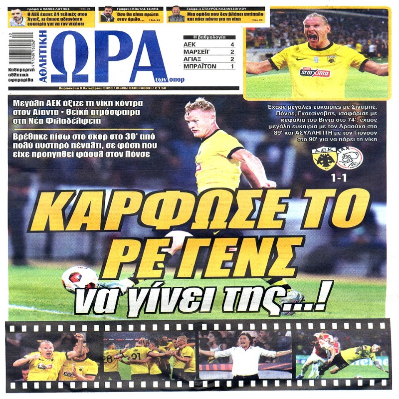 Διαβάστε το Σημερινό Πρωτοσέλιδο της Αθλητικής ΩΡΑΣ των σπορ, οπαδικής εφημερίδας της ΑΕΚ και όλα τα Πρωτοσέλιδα εφημερίδων 6/10/2023