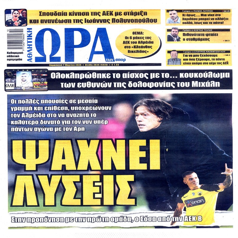 Πρωτοσέλιδα εφημερίδων 7/3/2025. Διαβάστε το Σημερινό Πρωτοσέλιδο της Αθλητικής ΩΡΑΣ των σπορ, οπαδικής εφημερίδας της ΑΕΚ και όλα τα Πρωτοσέλιδα των εφημερίδων