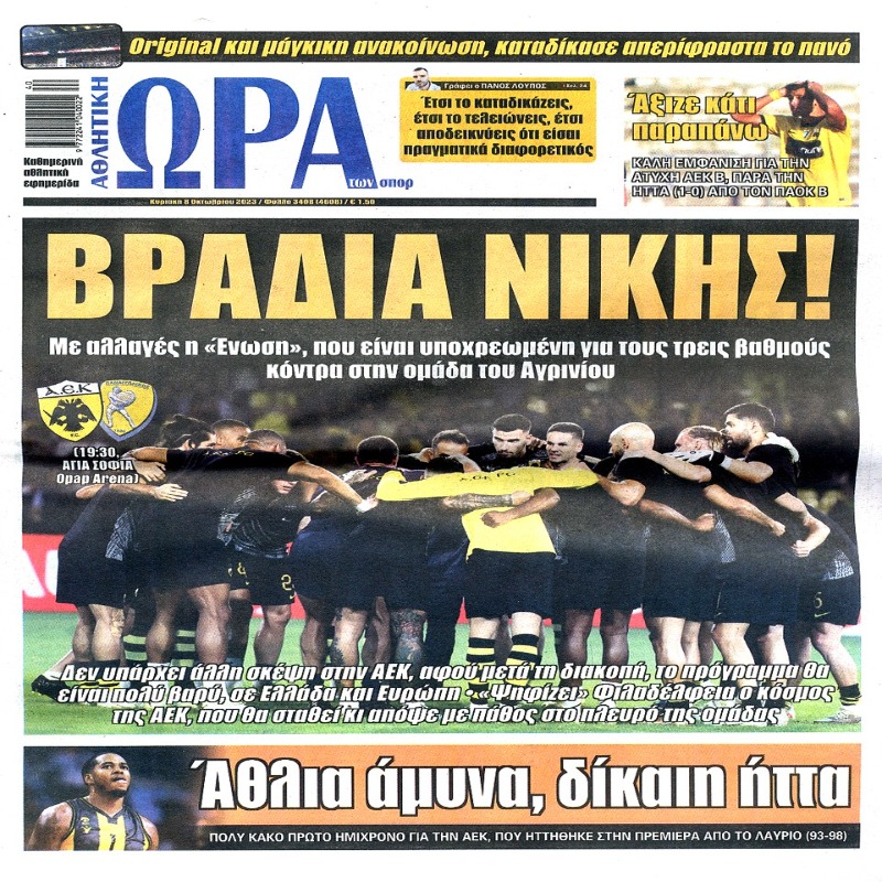 Διαβάστε το Σημερινό Πρωτοσέλιδο της Αθλητικής ΩΡΑΣ των σπορ, οπαδικής εφημερίδας της ΑΕΚ και όλα τα Πρωτοσέλιδα εφημερίδων 8/10/2023