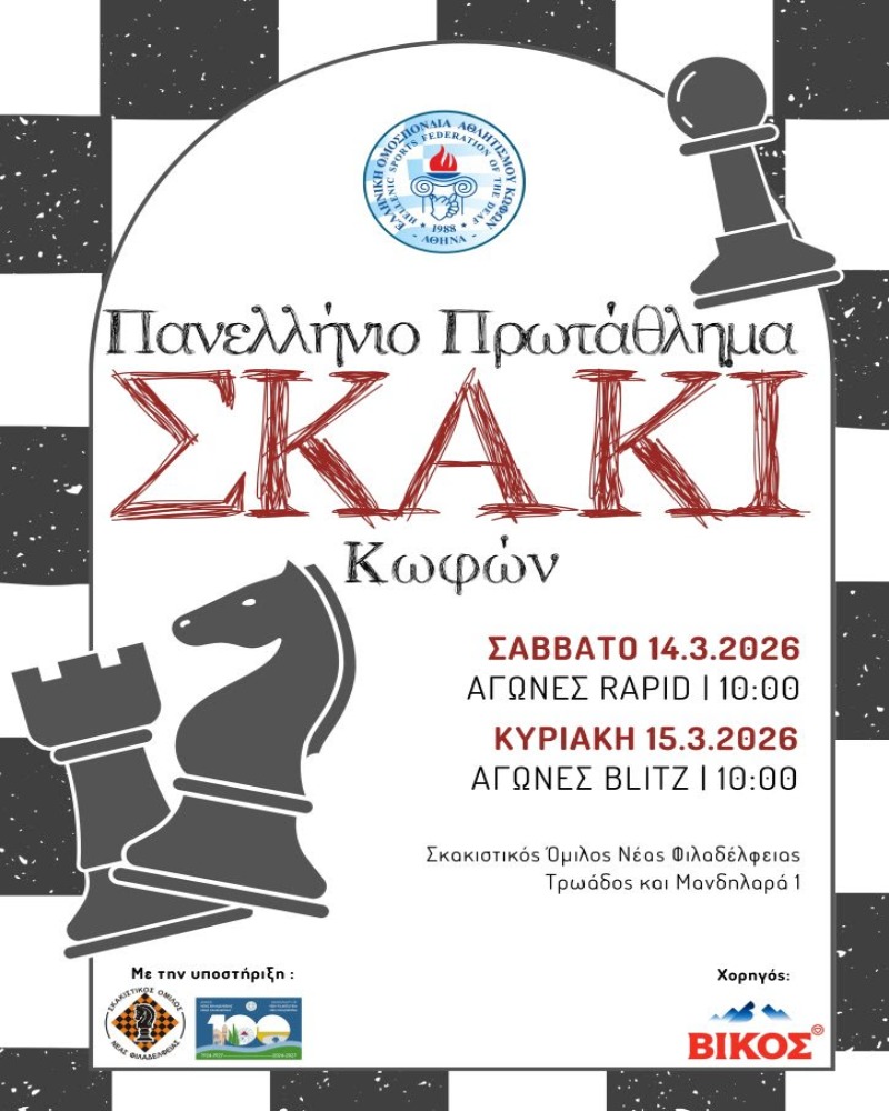 Για άλλη μια χρονιά ο Σκακιστικός Όμιλος Νέας Φιλαδέλφειας έχει τη χαρά να φιλοξενεί το 3o Πανελλήνιο Πρωτάθλημα Σκάκι Κωφών. Πρόκειται για μια σημαντική πανελλαδική διοργάνωση η οποία ξεκίνησε και συνεχίζει με επιτυχία στη Νέα Φιλαδέλφεια.