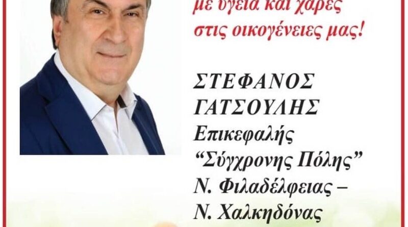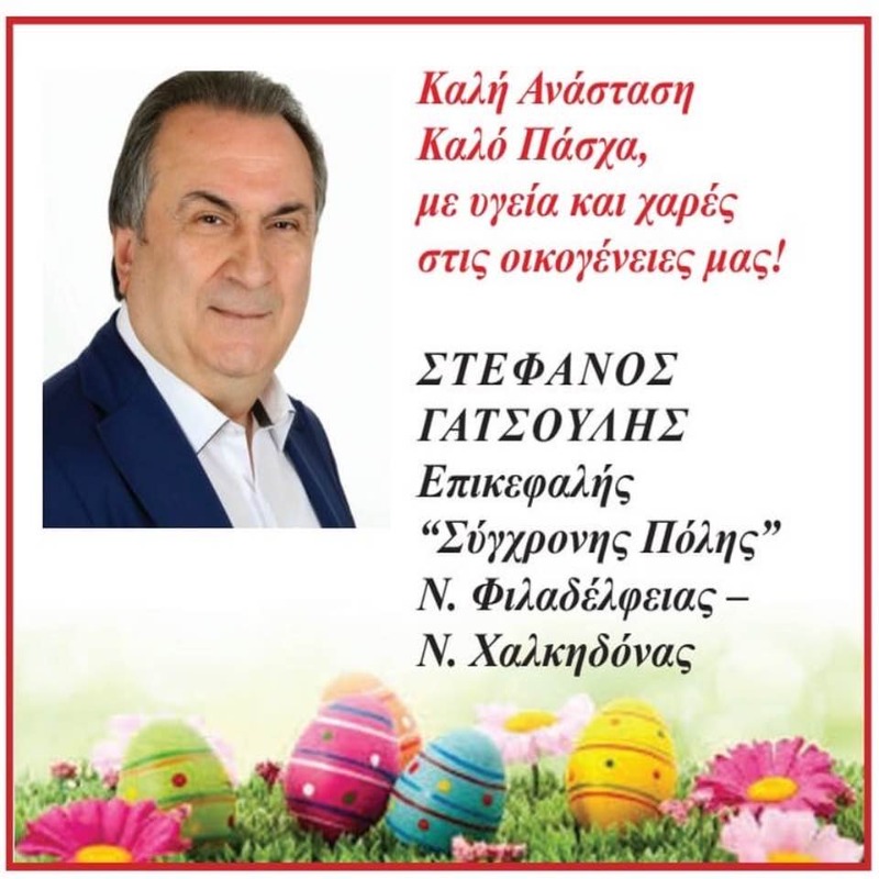 Τις θερμότερες ευχές του για τις Άγιες Ημέρες του Πάσχα στέλνει ο Στέφανος Γατσούλης, επικεφαλής της δημοτικής παράταξης «Σύγχρονη Πόλη» Νέας Φιλαδέλφειας – Νέας Χαλκηδόνας.