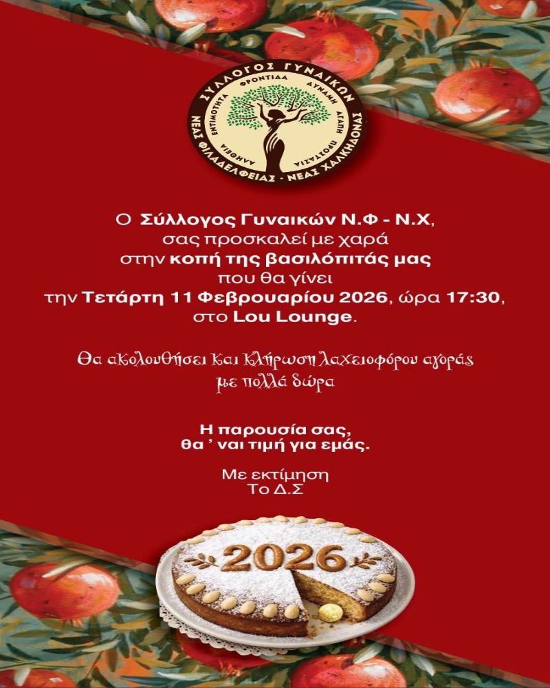 Ο Σύλλογος Γυναικών ΝΦ-ΝΧ, σας προσκαλεί με χαρά στην κοπή της βασιλόπιτας μας που θα γίνει την Τετάρτη 11 Φεβρουαρίου 2026, ώρα 17 30, στο Lou Lounge.
