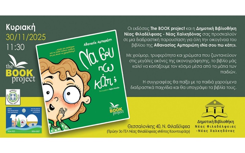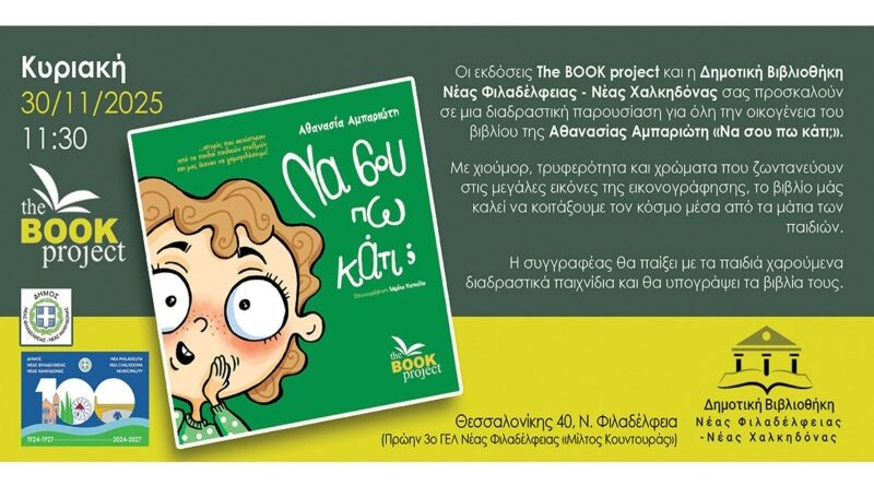The Book project και η Δημοτική Βιβλιοθήκη Νέας Φιλαδέφλειας – Νέας Χαλκηδόνας: Πρόσκληση παρουσίασης βιβλίου της Αθανασίας Αμπαριώτη “Να σου πω κάτι;” Κυριακή 30/11/2025