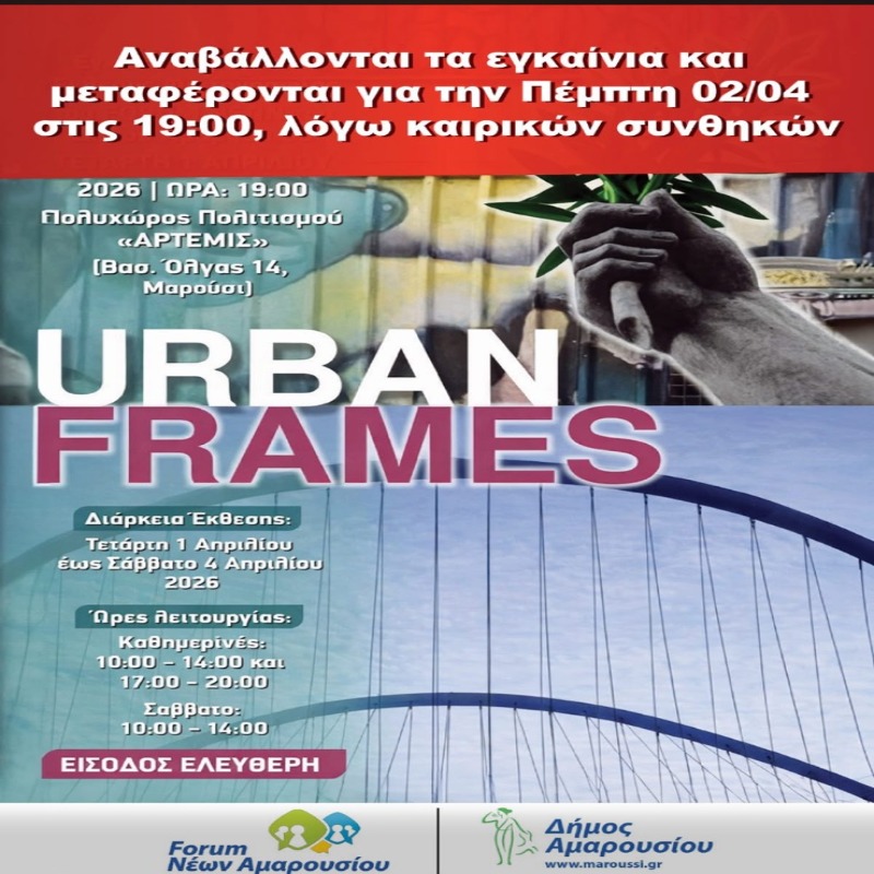 Ο Δήμος Αμαρουσίου και το Forum Νέων Δήμου Αμαρουσίου σας προσκαλούν στα εγκαίνια της ομαδικής έκθεσης φωτογραφίας «Urban Frames», την Πέμπτη 2 Απριλίου 2026 και ώρα 19:00, στον Πολυχώρο Πολιτισμού «Άρτεμις» (Βασ. Όλγας 14, Μαρούσι).