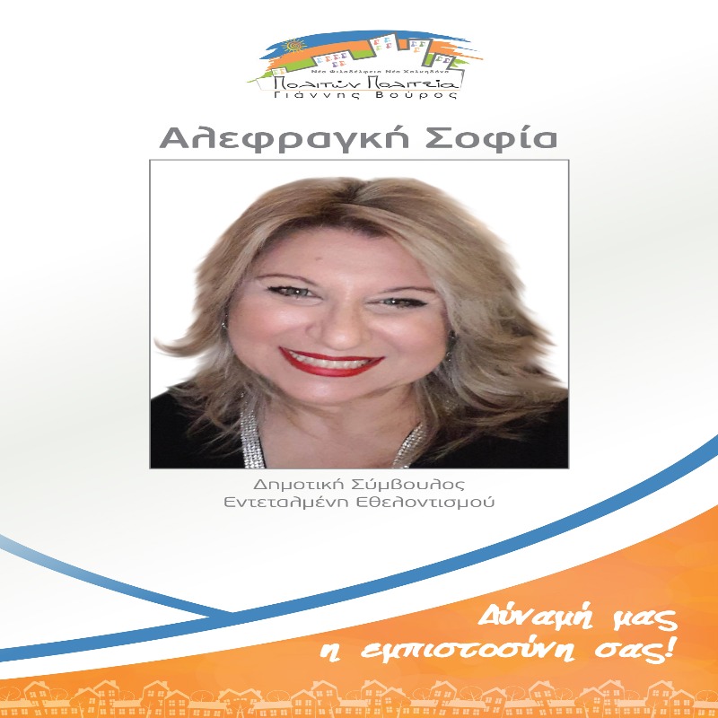 Υποψήφια με τον Ανεξάρτητο Συνδυασμό “Νέα Φιλαδέλφεια Νέα Χαλκηδόνα Πολιτών Πολιτεία” του Δημάρχου Γιάννη Βούρου θα είναι η δημοτική σύμβουλος Σοφία Αλεφραγκή